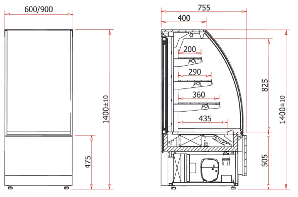 - oświetlenie wewnętrzne górne + podświetlenie każdej półki – świetlówki LED (cukiernicze)