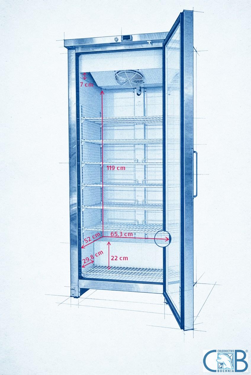 Szafa chłodnicza SR60VS o pojemności 590L wykonana jest ze stali nierdzewnej. Wnętrze malowane na biało. Posiada wymuszony obieg powietrza, elektroniczne sterowanie i termostat, możliwość zamknięcia na klucz oraz 2 kółka jezdne (z tyłu).