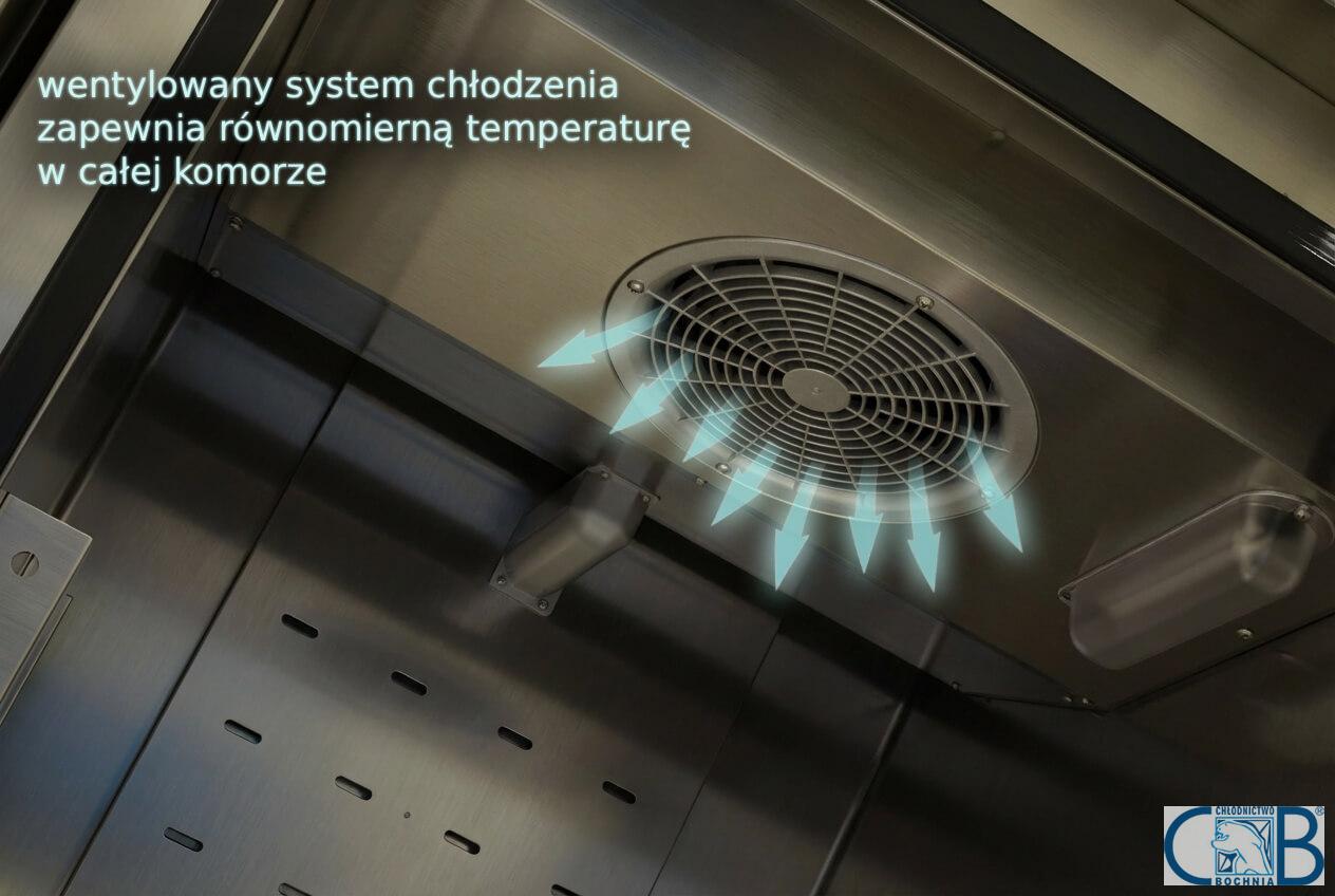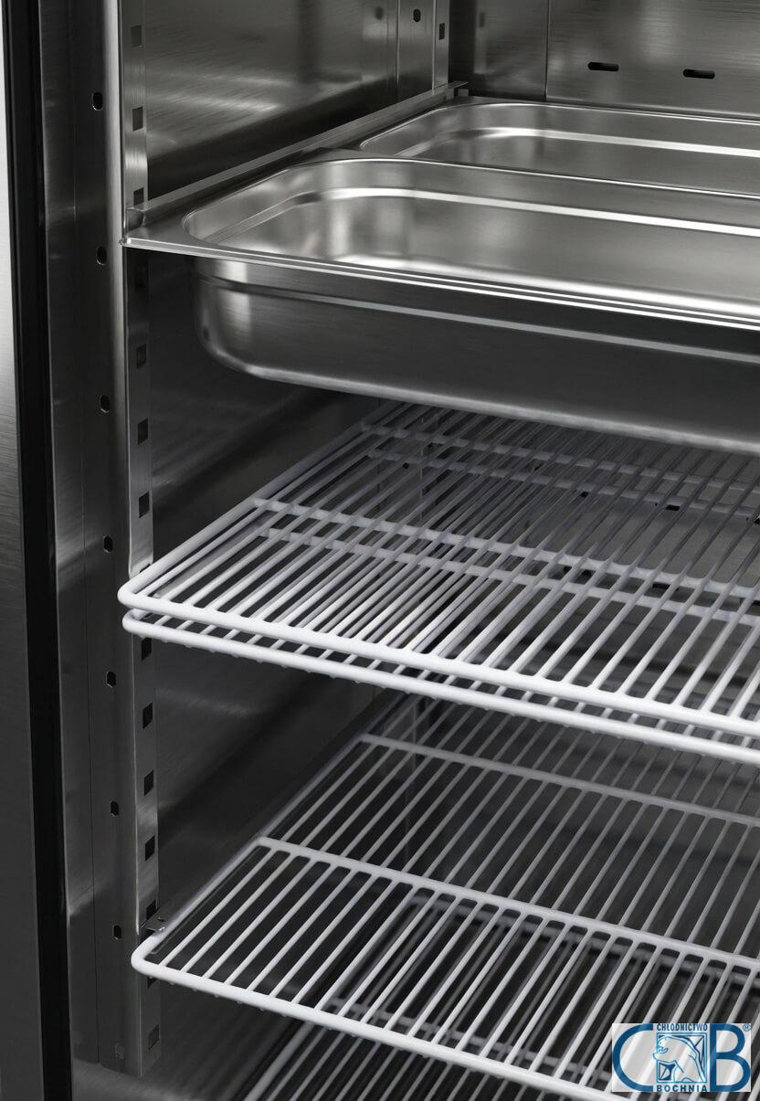 Gastronomiczna szafa chłodnicza MBF o pojemności 1400 litrów z agregatem umieszczonym u góry przystosowana do pojemników gastronomicznych GN 2/1. Wyposażona jest w chłodzenie nawiewowe (wymuszone wentylatorem) oraz automatyczne odszranianie i odparowywanie skroplin. Obudowa oraz wnętrze szafy wykonane są ze stali nierdzewnej.