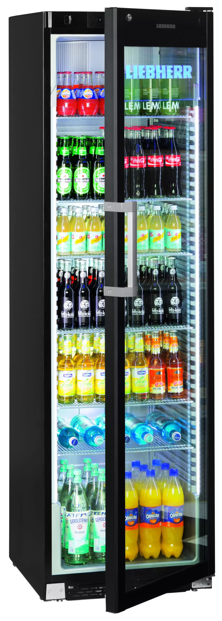 Szafa chłodnicza przeszklona o pojemności 441 l brutto. Kolor czarny. Idealna do ekspozycji towarów. Automatyczne rozmrażanie 6 poziomów półek. Wyposażona w zamek. Niskie zużycie energii.