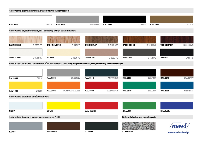 stelaż i profile w kolorze czarnym, białym, złotym lub srebrnym – wg wzornika Mawi