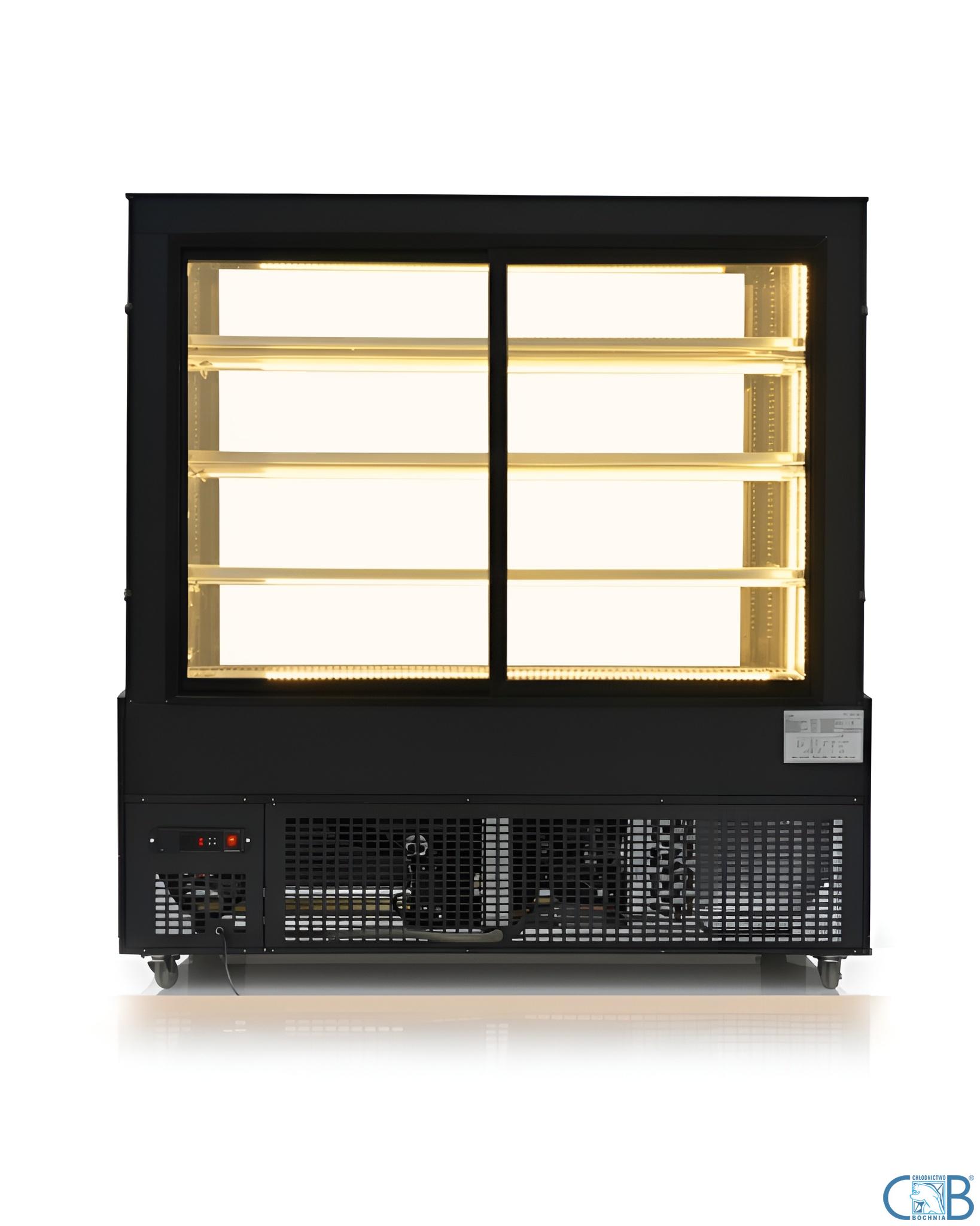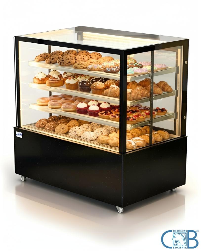 Pokaż więcej, sprzedaj skuteczniejHartowane szyby w podwójnej warstwie oraz nastrojowe światło LED sprawiają, że Twoje desery i wypieki prezentują się wyjątkowo kusząco. Ekspozycja, która przyciąga spojrzenia i zachęca do zakupu.Moc chłodzenia, na której możesz polegaćZastosowana sprężarka Cubigel to połączenie europejskiej precyzji i nowoczesnej technologii. Stabilne parametry pracy, oszczędność energii i niezawodność nawet w wymagających warunkach.Łatwość przemieszczaniaUrządzenie wyposażono w cztery mobilne kółka, z czego dwa z blokadą nożną. Elastyczne tworzywo kółek zapewnia ciche i płynne przesuwanie oraz chroni powierzchnię podłogi.Wygoda użytkowaniaDrzwi przesuwne poruszające się na rolkach gwarantują płynne otwieranie i zamykanie. System z pamięcią ustawienia eliminuje problem automatycznego odbijania, co ułatwia codzienną obsługę.Elegancja w detaluFront urządzenia zdobi płyta dekoracyjna „Galaxy” z subtelnymi, złotymi refleksami. To estetyczny akcent, który podkreśla prestiż całej ekspozycji.Światło dopasowane do potrzebTrzy punkty świetlne (dwa boczne i jeden górny) pozwalają wyeksponować każdy produkt. Funkcja niezależnego sterowania oświetleniem umożliwia tworzenie odpowiedniego nastroju bez wyłączania urządzenia.Praktyczne rozwiązania techniczneWymuszony obieg powietrza zapewnia równomierne chłodzenie, a pojemnik na skropliny z miedzianym przewodem zwiększa trwałość i ułatwia serwis.Najważniejsze parametry techniczne