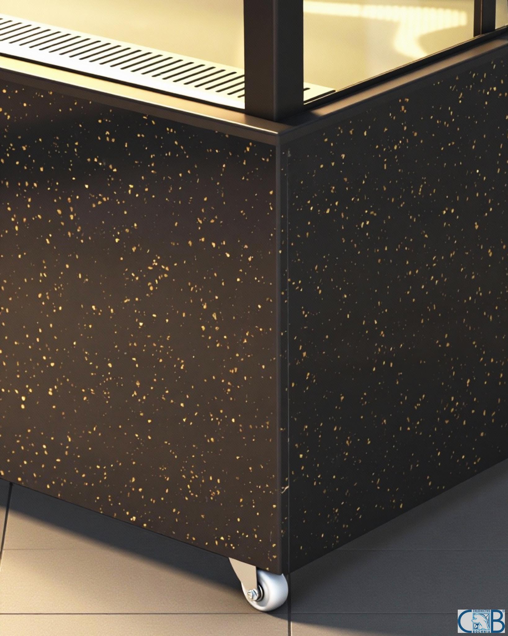 W sercu urządzenia bije sprężarka Cubigel — synonim hiszpańskiej jakości i niezawodności, która zapewnia stabilne chłodzenie, energooszczędność i bezawaryjną pracę przez lata. Każdy element dopracowano w najdrobniejszym szczególe: kółka, które miękko suną po podłodze, drzwi przesuwne z pamięcią regulacji ułatwiające dostęp do produktów, czy dekoracyjna płyta „Galaxy” ze złotymi refleksami, która podkreśla luksusowy charakter urządzenia. Wyeksponuj więcej, sprzedaj szybciej — podwójne szyby z hartowanego szkła i ciepłe, nastrojowe LED-y tworzą scenę, na której Twoje produkty błyszczą pełnym smakiem. Klienci nie tylko zobaczą, ale zapragną spróbować. Chłodzenie bez kompromisów — sercem witryny jest sprężarka Cubigel. Symbol profesjonalizmu, gwarancja niezawodności i efektywności. Stabilna temperatura, niskie zużycie energii i pewność działania nawet przy największym obciążeniu. Mobilność z klasą — cztery solidne kółka, w tym dwa z hamulcami nożnymi, sprawiają, że witryna przesuwa się lekko, a zatrzymuje stabilnie. Miękki materiał kółek chroni podłogę i zapewnia płynność ruchu bez zbędnego hałasu. Ergonomia na najwyższym poziomie — drzwi przesuwne na rolkach z pamięcią regulacji otwierają się płynnie i nie odbijają. Obsługa staje się intuicyjna, szybka i bez wysiłku, nawet w godzinach szczytu. Design, który przyciąga wzrok — front ozdobiony płytą „Galaxy” ze złotymi wtrąceniami. Każdy refleks światła podkreśla luksusowy charakter urządzenia, dodając prestiżu Twojej ekspozycji. Światło pod pełną kontrolą — trzy punkty świetlne rozmieszczone strategicznie (dwa przy słupkach i jeden u góry) pozwalają wyeksponować każdy detal. Dodatkowo funkcja niezależnego sterowania światłem umożliwia stworzenie idealnej atmosfery bez konieczności wyłączania urządzenia. Technologia, która pracuje dla Ciebie — wymuszony obieg powietrza dba o równomierną temperaturę na każdej półce, a pojemnik na skropliny z przewodem miedzianym zapewnia wygodę i bezobsługowość na co dzień.