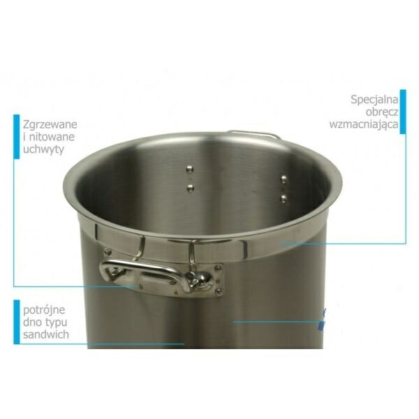 Profesjonalny garnek z pokrywką wykonany ze stali nierdzewnej o poj. 115 litrów (Ø 50 cm, h=60 cm). Charakteryzuje się wyjątkową wytrzymałością dzięki specjalnej obręczy wzmacniającej oraz nitowanym uchwytom.